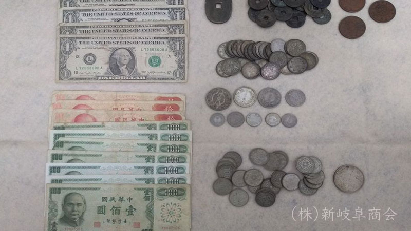 中国札・米ドル札・東京五輪記念硬貨・穴銭・銅貨・20銭.50銭銀貨買取しました