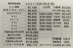 金・プラチナ・銀・貴金属買取価格 2021年5月29,30日(土,日)