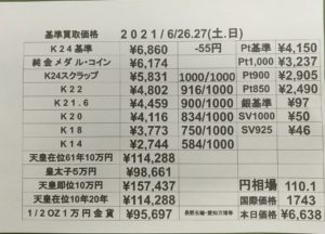 金・プラチナ・銀・貴金属買取価格 2021年6月26,27(土,日)