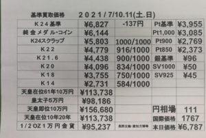 金・プラチナ・銀・貴金属買取価格 2021年7月10,11(土,日)